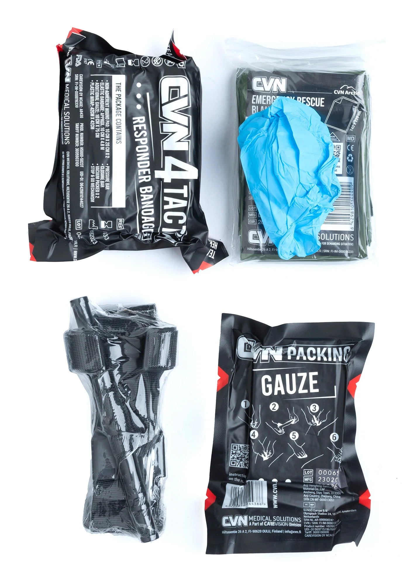 Kukin tuote on pakkauksen sisällä vielä omissa muovikääreissään. Pakkaus kantsii avata ja kiristysside purkaa muoveistaan, että sen käyttö hätätilanteessa on mahdollisimman nopeaa. Voit pakata kamppeet sit sopivaan ensiaputaskuun, esimerkiksi meidän IFAK-taskuun.